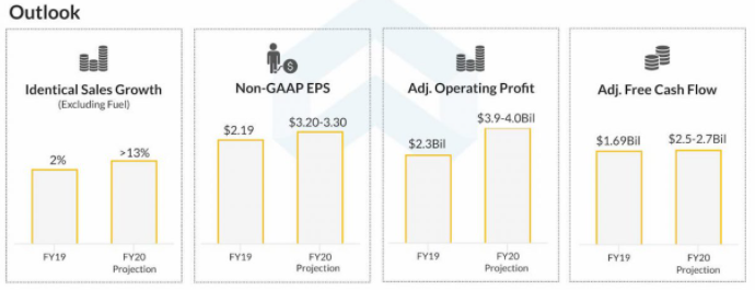 크로거는 FY20 동일 매장 매출 증가율을 13% 이상으로 제시하고 있으며 EPS 전망치도 전년 동기대비 약 50% 증가한 수준을 제시하고 있습니다.