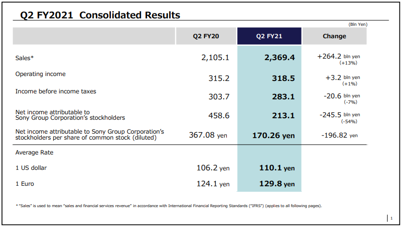 지난 2021년 10월 말 공개한 소니의 가장 최근 실적인 Q2 FY2021 실적을 확인해보겠습니다.